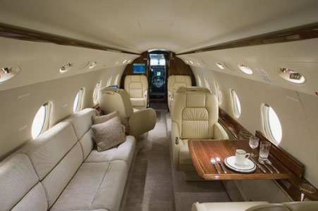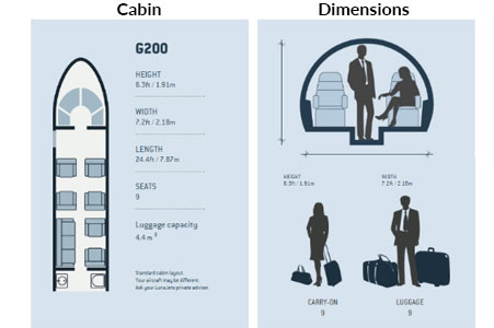 G200’s range, size, enduring performance and panache of the Gulfstream brand makes it a leader in the Super midsize class aircraft category. The large cabin in the G-200 can be arranged for 8 to 10 passengers with alternate seating for up to 18. The cabin has a stand-up height of 6 feet 3 inches, large plush seating, and sunny oval windows are typical to Gulfstream making it an ideal choice for most jet charter itineraries. A dual climate control system provides flyers with fresh air rather than re-circulated air.