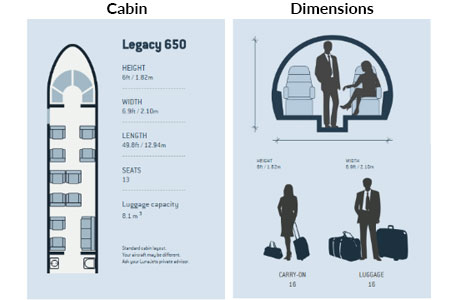 Embraer Legacy 650’s sheer power and performance matches its high reliability and versatility. The spacious cabin space is perfectly suited to conduct business meetings and events for up to 13 passengers on the go. The Legacy 650 jet charter also features one of the quietest cabins in its class, ensuring the ride is smooth and pleasant, further it can land at some of the airports with noise restrictions. The Legacy 650 jet charter also gives pilots steep-approach capability, as well as exceptional hot-and-high airport performance.